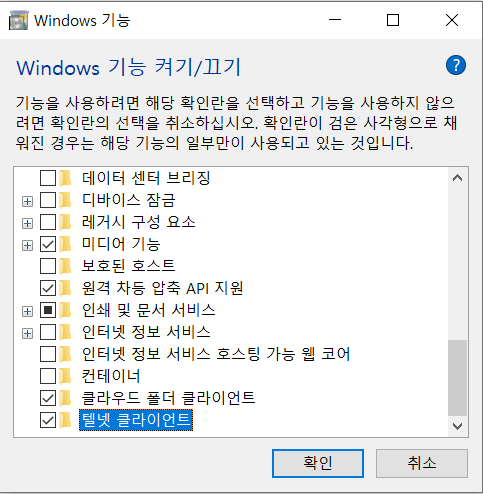 단, Telnet 서비스는 보안에 취약한 이유로 윈도우즈 10에서는 해당 서비스를 기본 설정으로 비활성합니다.